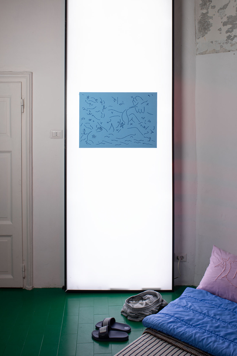 Angelo Leonardo nasce nel 1991 a Enna. La sua ricerca è volta a rimediare qualsiasi pretesto per rendere ogni sforzo vano nel tentativo di vivere un tempo intero, minimo, epico. Dal 2014 fa parte di E IL TOPO. Ricama le tele seduto comodo e avvolto da qualsiasi cosa lo protegga dal freddo. In estate non fa nulla. Per il resto produce incomprensibili infografiche parietali, frammenti onirici, lingue morte mischiate ad altri segni che coglie avidamente. Rabdomante di eventi della Storia, che ruba e poi deforma, scompone e poi rimescola. Ostruisce le intersezioni tra fantasia e archeologia, politica e fisica. Cuce deflagrazioni atomiche. Fodera i cuscini di federe ricamate di incubi di cotone, la transustanziazione dei buchi neri in sogni d’oro.